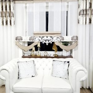 Dekoracyjne, zwiewne zasłony w górnej części z eleganckim wzorem ornamentowym w odcieniach kremowo brązowych, w dolnej części materiał markizeta sable deszczyk, dzięki której zasłony delikatnie prezentują się i tworzą spójny zestaw wraz z panelami.