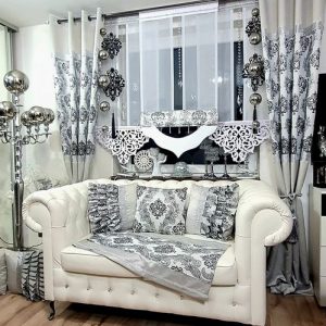 Panele uszyte z srebrnej markizety z przerwą na efektowne koraliki na usztywnionej kancie z doszytym efektownym wykończeniem ażurowym zasłonki dopełniają aranżacje.