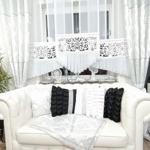 Panele uszyty z delikatnego snieżnobiałego woalu muślinowego z delikatnym wzorem w listki na usztywnionej kancie z doszytym efektownym wykończeniem azurowym ten sam wzor od zewnętrznej strony dzieki czemu panele prezentują sie równie elegancko zewnatrz jak i wewnątrz w połączeniu z akcentami kwiatowymi w odcieniu kwitnącego bzu, zasłony dwuczęściowe gorna część uszyta z materiału ze wzorem kwiatowym połączona ze zwiewnym woalem nadaje calej kompozycji lekkości dopełnia aranżacje ktora równie świetnie prezentuje sie w salonie , sypialni pasuje do wnętrz nowoczesnych jak i klasycznych