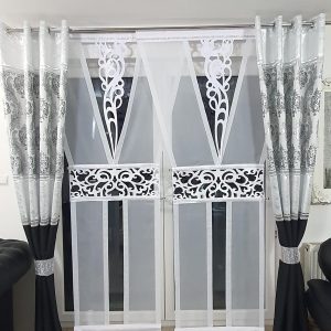 Panele uszyte z woalu z przerwą na ozdobne koraliki na usztywnionej kancie z wzorem kwiatowym z doszytym efektownym wykończeniem ażurowym.